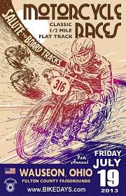 This is your gate ticket. Please do not take it off.Entry Fees:Pre-Entry Deadline:Entry Form Page: click hereBike Days LLC reserves the right to accept or reject any and all race entries. is not a pit pass. Riders and crew will continue to purchase pit passes at the pit gate entrance upon arriving at thePre-Registered Riders are required to “check in” at the Bike Days Rider Registration trailer between 10:00 am and 1:30 pm.Event T-Shirts: Each rider that pre-registers by June 15, 2013 (postmarked) will receive one FREE Bike Days t-shirt. Release of Liability:Pit Area for “directNumber Plates:AwardsNO Pit Racing.CampingFood ConcessionsChristian Flat Track MinistriesThe Wauseon National MeetGeneral InformationHotel information ANTIQUE MOTORCYCLE CLASSES2013 WAUSEON NATIONAL RACES1-BTBOARD TRACK – TEENS THRU 19281. No gearbox or clutch (if running, transmission must be locked in one gear).3. start.4. Wheels & Tires: 28 x 2 1/4 ribbed racing tires on clincher rims or 28 x 3 tires on clincher rims or 21